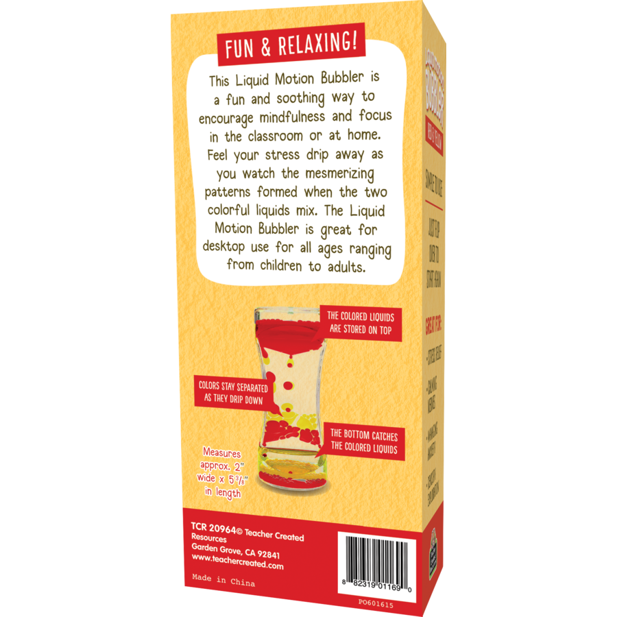 This Liquid Motion Bubbler is a fun and soothing way to encourage mindfulness and focus in the classroom or at home. Feel your stress drip away as you watch the mesmerizing patterns form when the two colorful liquids mix. It’s fun, relaxing, and simple to use—just flip over to start again. It's a perfect desktop tool for all ages ranging from children to adults. Measures 2" x 5⅜".