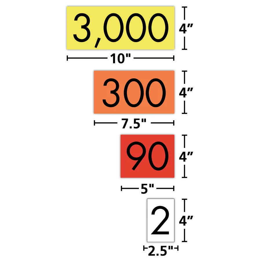 These color-coded cards provide students with a visual representation of place value and help them develop number sense. Teachers use these cards to visually show expanded form of numbers by place value, greater than, less than, addition and subtraction without regrouping, multiplying numbers, and more. (Color-coding system matches Sensational Math™ Place Value Discs.) The cards are all 4" high and range in length from 2½" to 10", depending on place value. Each set is packaged in a re-sealable poly bag for handy storage. A GEI Endorsed Product.