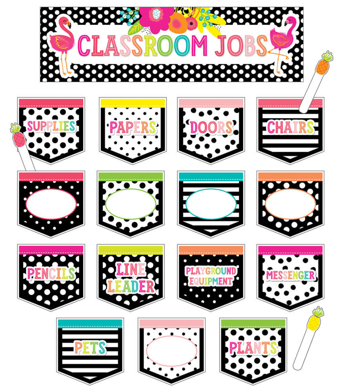 The Simply Stylish Tropical Classroom Jobs Mini Bulletin Board set includes these 44 pieces: