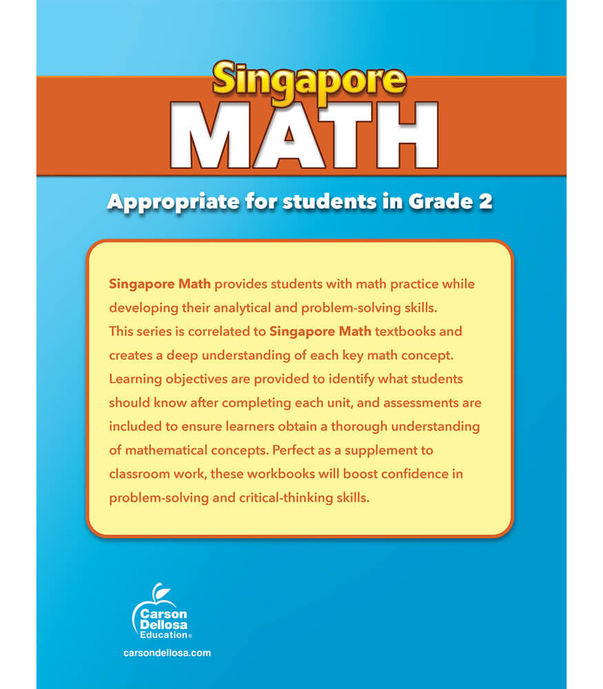 Singapore Math creates a deep understanding of each key math concept, is a direct complement to the current textbooks used in Singapore,includes an introduction explaining the Singapore Math method, and includes step-by-step solutions in the answer key. Singapore Math, for students in grades 2 to 5, provides math practice while developing analytical and problem-solving skills. Learning objectives are provided to identify what students should know after completing each unit, and assessments are included to ensure that learners obtain a thorough understanding of mathematical concepts. Perfect as a supplement to classroom work, these workbooks will boost confidence in problem-solving and critical-thinking skills!