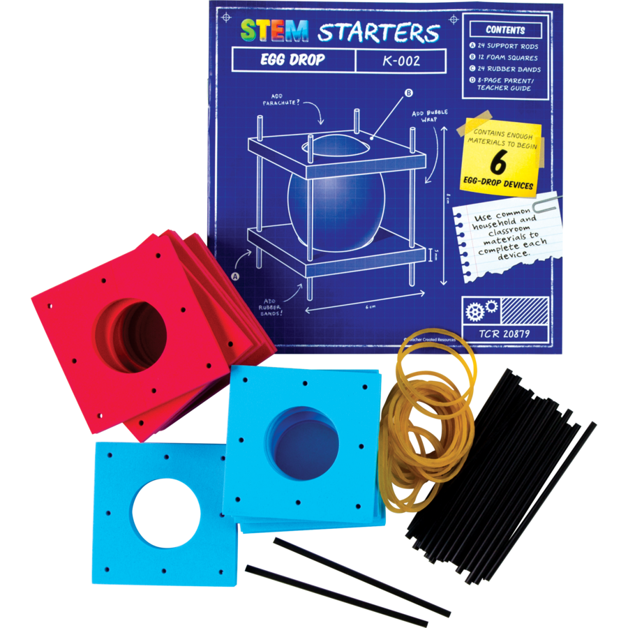 This Egg Drop activity kit challenges students to create a device that can protect an egg when dropped from an elevated position. The essential pieces—foam square, rubber bands, and plastic support rods—are provided; it's up to the young scientists to determine the best materials to use in order to protect their egg. Includes enough materials to begin 6 egg drop devices. 60 total pieces. Ages 8+.