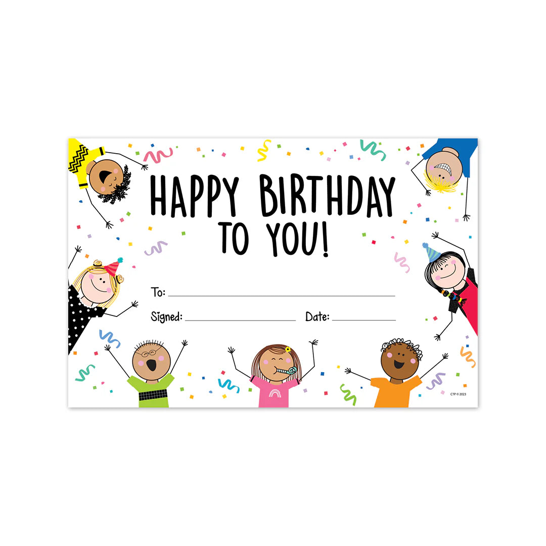 Celebrate birthdays with these colorful awards featuring the multicultural Stick Kids. Awards are printed on sturdy paper stock so students can enjoy them for years to come. 30 colorful awards per package.
