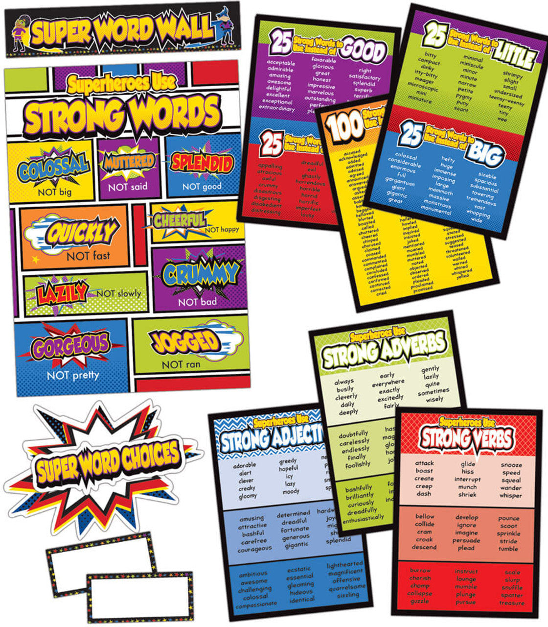 Encourage your students to use strong verbs, adjectives, and adverbs with the 43-piece Super Power Super Word Choices bulletin board set. Use the charts and word wall as decor to remind students that powerful word choice is essential to strong communication. Each set includes: