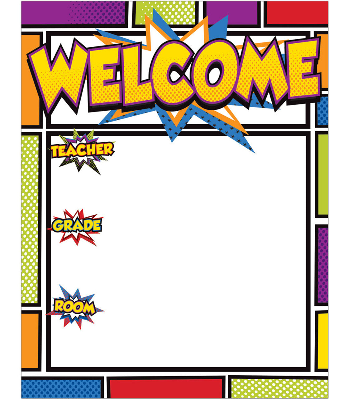 Energize your learning environment with the Super Power collection. The Super Power Welcome chartlet features writing space to display your name, grade, and room number, making it easy to welcome students and parents to your classroom.