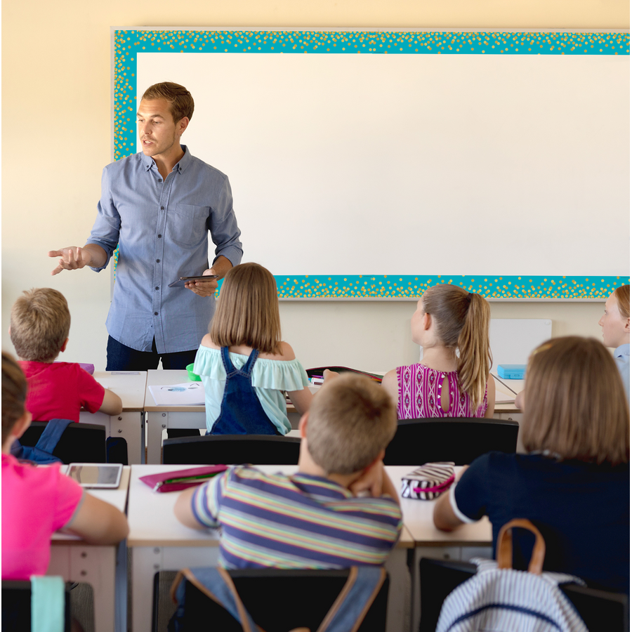 Use Teal Confetti Straight Border Trim to liven up your classroom! Create fresh looks for bulletin boards, windows, walls, and class projects. Mix and match with coordinating products (stickers, notepads, awards, etc.) for a classroom theme. Each pack has 12 pieces (3'' x 35'') for a total length of 35 feet of trim