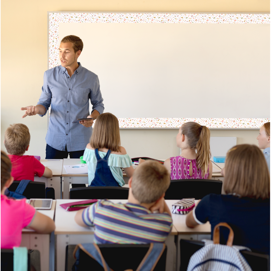 Use this terrazzo tones border trim to liven up your classroom! Create fresh looks for bulletin boards, windows, walls, and class projects. Mix and match with coordinating products (stickers, notepads, awards, etc.) for a classroom theme. Each pack has 12 pieces (3'' x 35'') for a total length of 35 feet of trim!