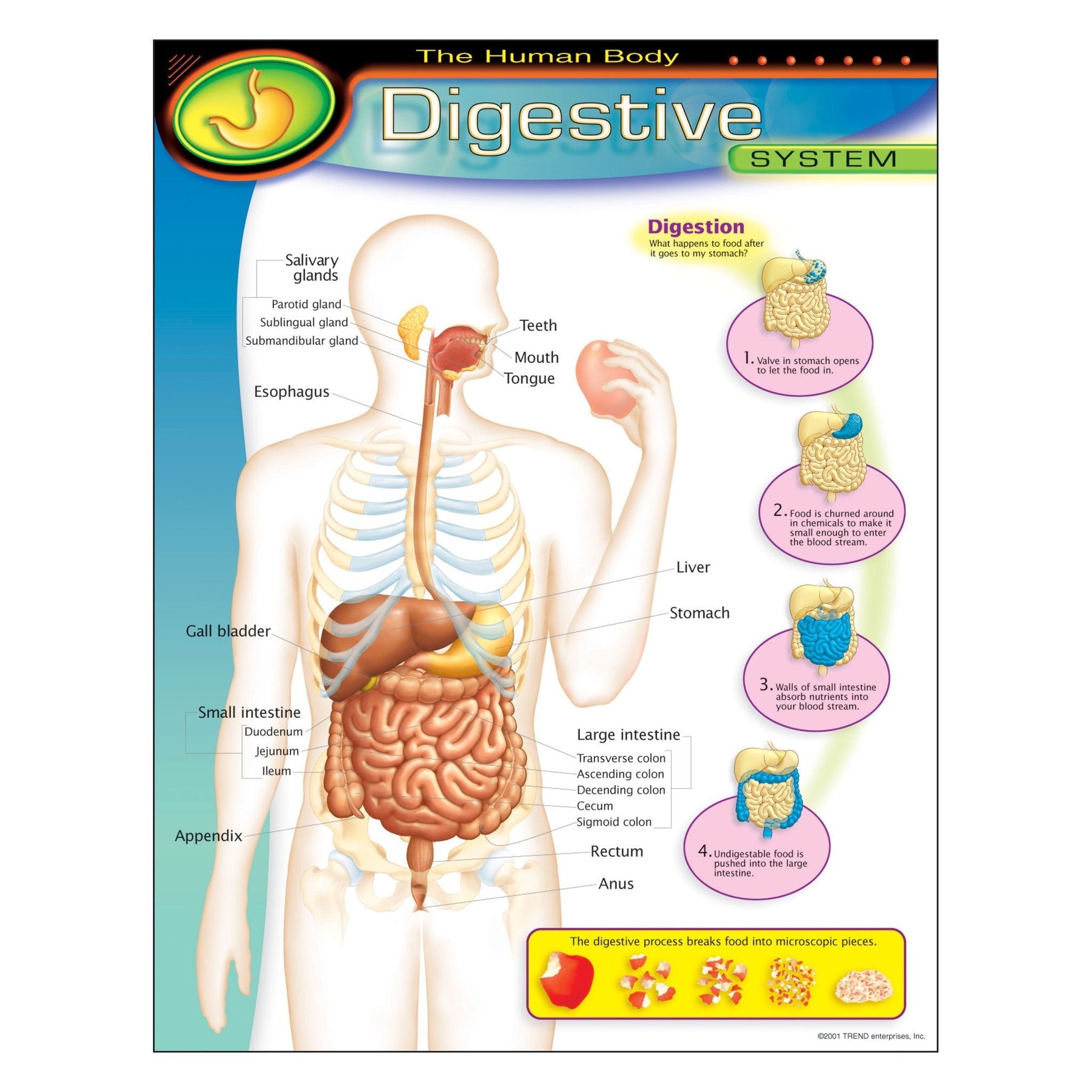 Large illustration shows major elements of the human digestive system. Insets illustrate the digestive process. Rich content engages viewers and aligns with Learning Standards.