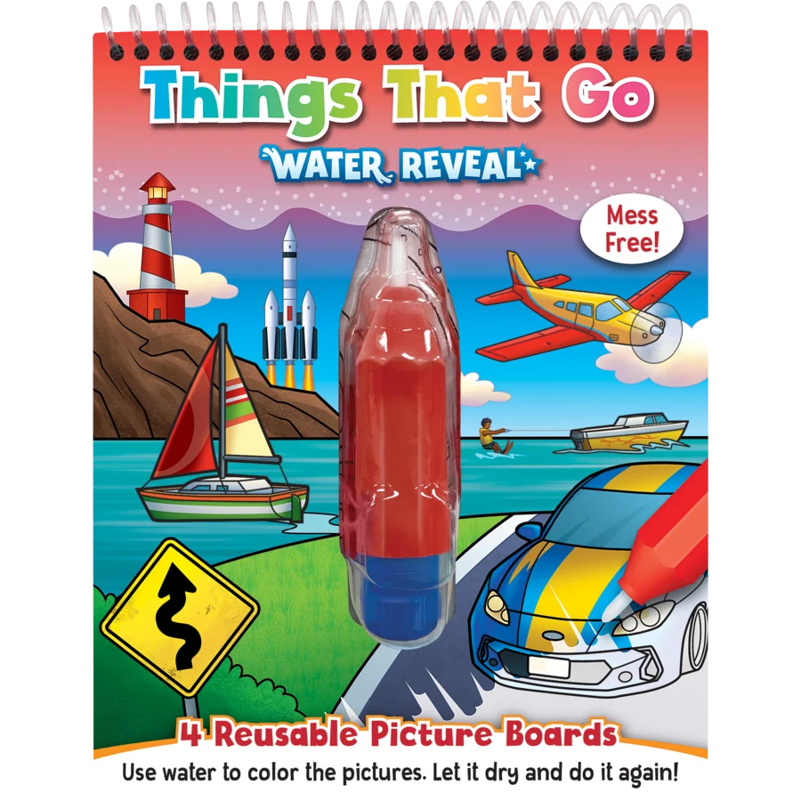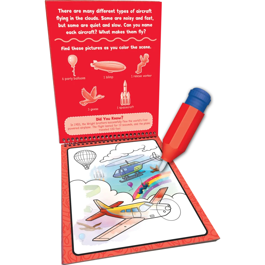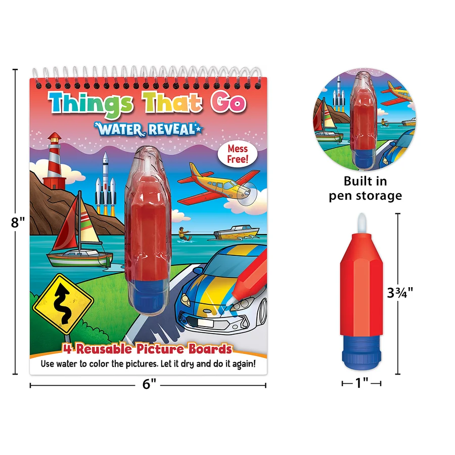 Mess free! Use water to color the pictures. Let it dry and do it again! Includes search and find activities plus an educational fact. Comes with 4 reusable picture boards and 1 refillable water pen. Ages 3+