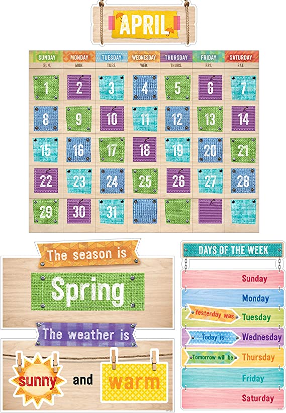 The Upcycle Style interactive Calendar brings the cozy look and feel of rustic wood, familiar fabrics and playful textures to your calendar bulletin board. Use the moveable pieces to teach calendar concepts display the month of the year, the days of the week, and record the changing seasons and daily weather conditions. Cute calendar accents such as "wooden" clothespins and "rope" give this set a charming feel. The realistic looking mixed mediums of burlap, colored canvas, metal accents and distressed cardboard make this set feel modern but very warm and friendly. This 67-piece calendar set contains a "wood" calendar chart, 12 month headlines, 31 pre-numbered calendar days, and 4 blank calendar days. The set also includes a days-of-the-week chart, a seasons and weather chart, and coordinating labels.