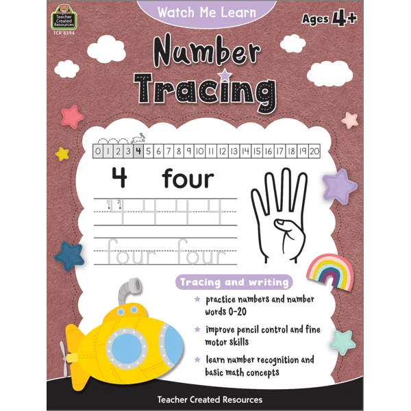 Watch Me Learn: Number Tracing is a beginning numbers book with a simple format designed to build young learners confidence as they explore numbers and number amounts. Each number 0–20 has two practice pages featuring the numeral, the number word, and the lines to practice writing each. Art and a ten frame are provided to show each number amount. Additional pages are provided to practice number order and to introduce number concepts including addition and subtraction, odd and even, before and after, and beginning graphing. Skill-building activities and practice pages are great for independent work in class, homework assignments, or extra practice to get ahead.