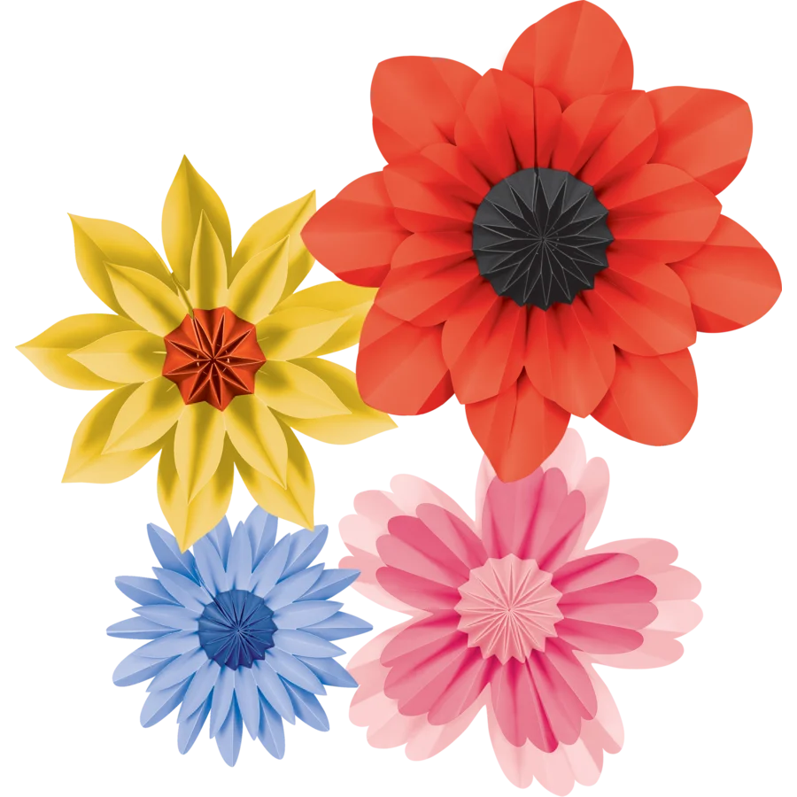 Create a colorful and unique look with these gorgeous paper flowers in a fresh and lively color palette. Add depth and dimension to walls, backdrops, table decorations, and much more! No assembly required—opens easily and stays together with a hidden magnet. Folds back up for easy storage, so they can be used again and again. Four flowers per pack. Each pack includes one 16", two 11", and one 8" in diameter.